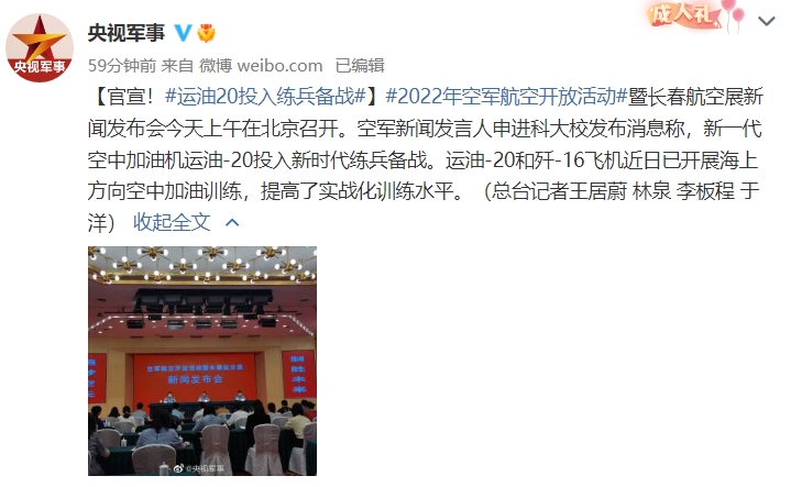 2022年空军航空开放活动暨长春航空展新闻发布会今天上午在北京召开。空军新闻发言人申进科大校发布消息称,新一代空中加油机运油-20投入新时代练兵备战。运油-20和歼-16飞机近日已开展海上方向空中加油训练,提高了实战化训练水平。(总台记者王居蔚 林泉 李板程 于洋)