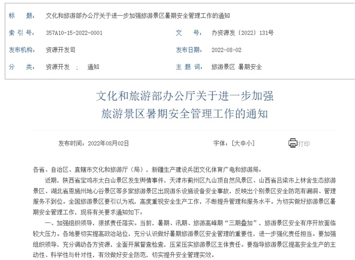 文旅部网站2日发布《文化和旅游部办公厅关于进一步加强旅游景区暑期安全管理工作的通知》(以下简称《通知》),《通知》称,近期,陕西省宝鸡市太白山景区发生舆情事件,天津市蓟州区九山顶自然风景区、山西省吕梁市上林舍生态旅游景区、湖北省恩施州地心谷景区等多家旅游景区出现游乐设施设备安全事故,反映出个别景区安全防范有漏洞、管理服务不到位。全国旅游景区要引以为戒,高度重视安全生产工作,不断提升管理和服务水平。