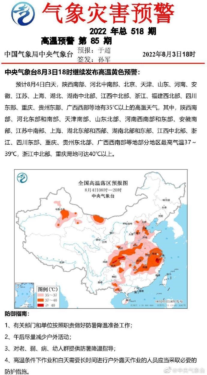 中央气象台继续发布高温黄色预警,明日四川东部等地有35℃以上高温天气