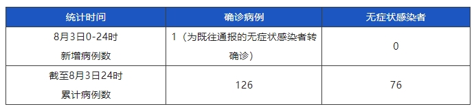 8月3日0-24时,“07·20”疫情新增本土确诊病例1例(为既往通报的无症状感染者转确诊),无新增本土无症状感染者。截至8月3日24时,本起疫情累计报告本土确诊病例126例,本土无症状感染者76例。