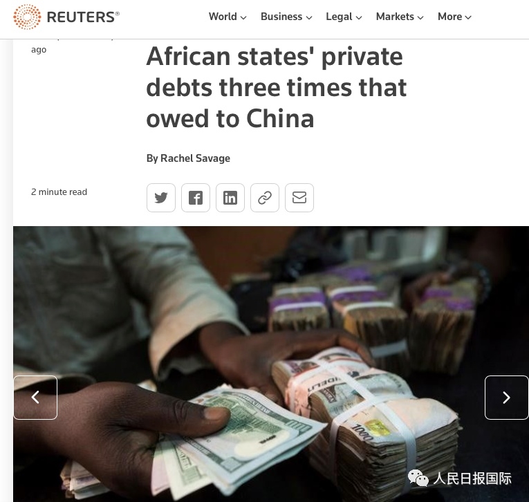 据路透社报道,非洲国家所欠私人机构债务是中国债务的3倍。来源:路透社网站