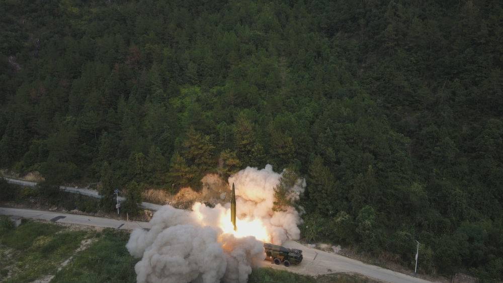 8月4日,东部战区火箭军对台岛东部外海预定海域实施火力突击。这是导弹发射升空(视频截图)。新华社发