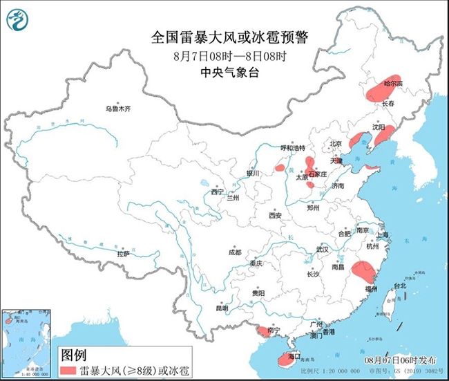 图2 全国雷暴大风或冰雹预警(8月7日08时-8日08时)