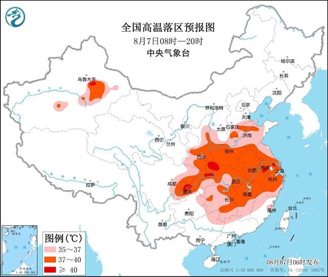 预计8月7日白天,河北南部、山西南部、陕西大部、河南、山东、江苏、安徽、上海、湖北、湖南、江西、浙江、福建西部、四川盆地、重庆以及新疆吐鲁番和南疆盆地东部等地有35~39℃的高温天气,其中,安徽南部、江苏南部、重庆南部、湖北西部、新疆吐鲁番等地局地可达40℃或以上(见图3)。中央气象台8月7日06时继续发布高温黄色预警。