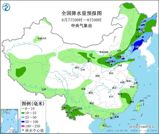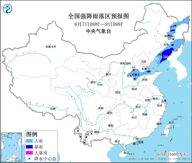 预计,7日08时至8日08时,山西中北部、河北中南部、辽宁中东部、吉林东部、黑龙江中东部、云南西部和南部等地部分地区有大雨,其中,辽宁东部等地的部分地区有暴雨,局地大暴雨(100~120毫米)。上述部分地区伴有短时强降水,局地雷暴大风或冰雹等强对流天气。中央气象台8月7日06时发布暴雨预报(见图1)并继续发布强对流天气蓝色预警(见图2)。