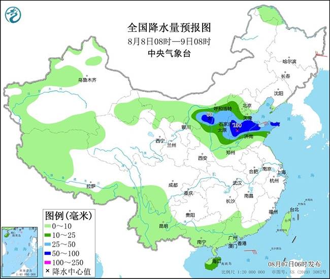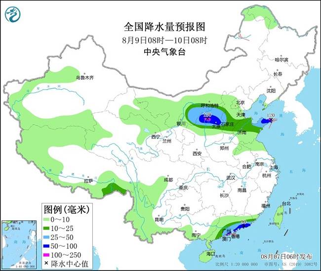 8月8日08时至9日08时,内蒙古西部、陕西北部、华北大部、黄淮东部、海南岛等地部分地区有中到大雨,其中,内蒙古河套地区、陕西北部、河北南部、山东北部等地部分地区有暴雨或大暴雨(100~150毫米)(见图5)。
