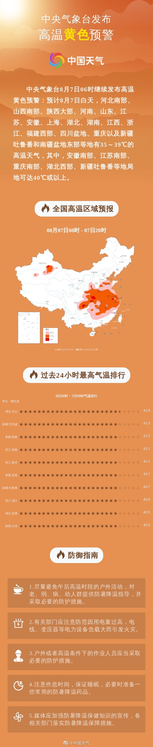 预计8月7日白天,河北南部、山西南部、陕西大部、河南、山东、江苏、安徽、上海、湖北、湖南、江西、浙江、福建西部、四川盆地、重庆以及新疆吐鲁番和南疆盆地东部等地有35~39℃的高温天气,其中,安徽南部、江苏南部、重庆南部、湖北西部、新疆吐鲁番等地局地可达40℃或以上。