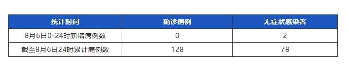 8月6日0-24时,“07·20”疫情无新增本土确诊病例,新增本土无症状感染者2例。截至8月6日24时,本起疫情累计报告本土确诊病例128例,本土无症状感染者78例。