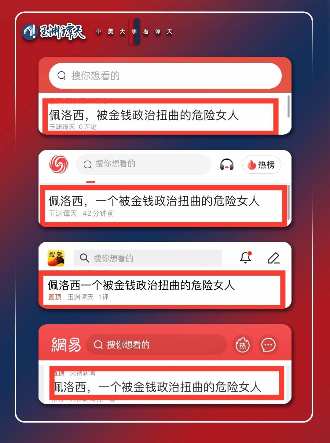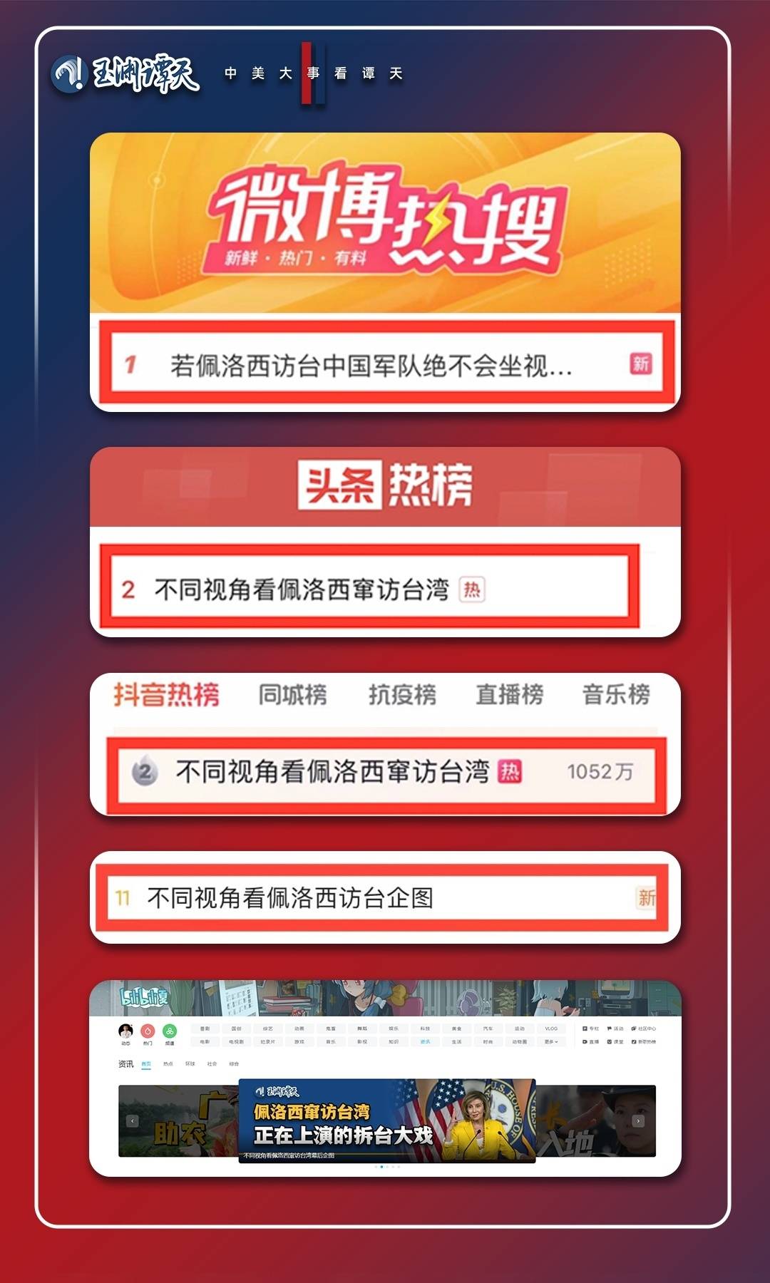 【深谭】报道全网总触达量近5亿次,报道设置的“丑闻缠身的投机分子”这一标签深入人心,多家国内外主流媒体以此为角度进行再创作。“投机分子”等词,成为知乎、今日头条、抖音、百度等平台用户,在佩洛西相关报道下的评论热词。