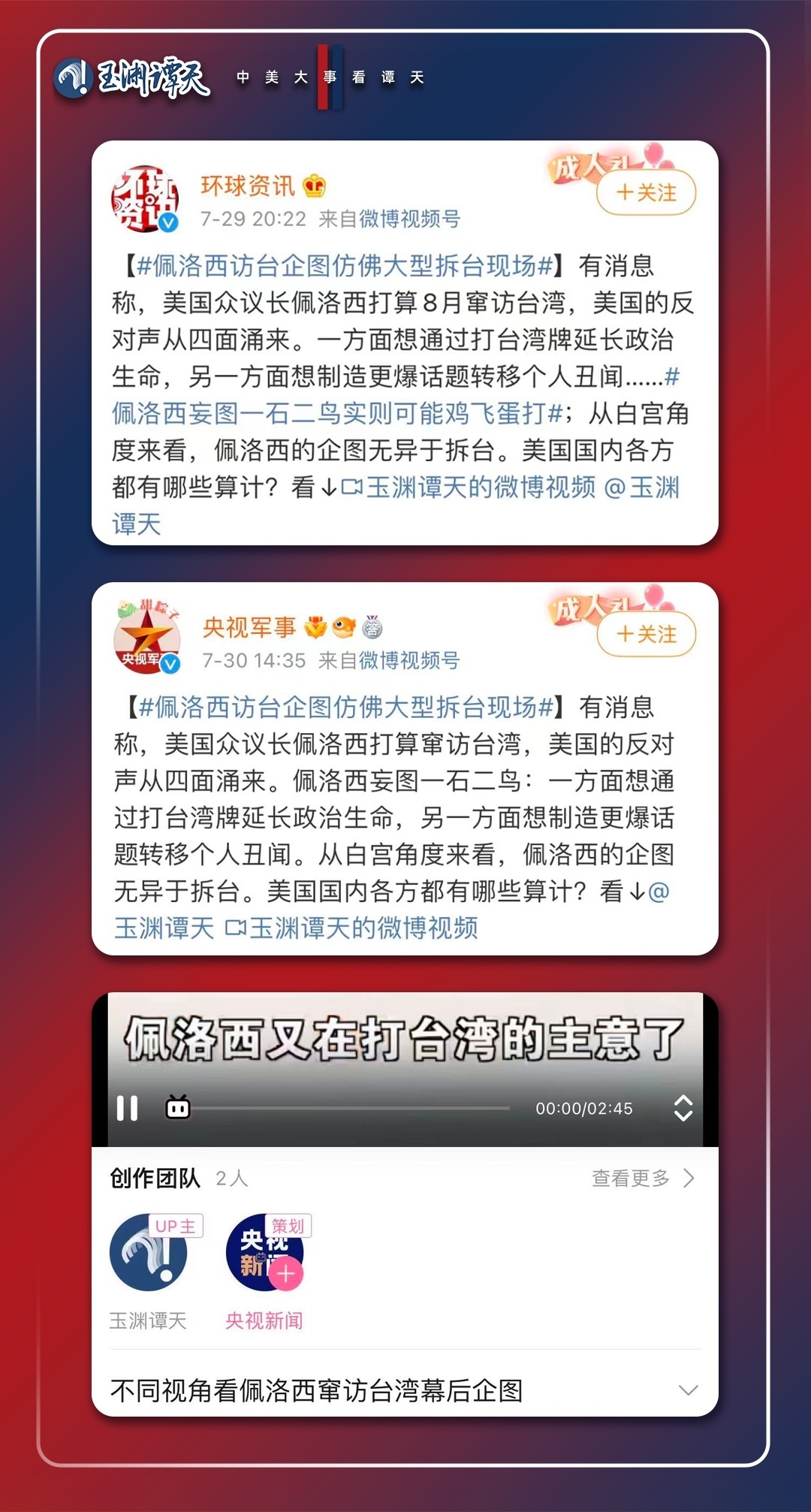 8月3日,玉渊谭天微信公众号首发报道《【深谭】丑闻缠身的投机分子,佩洛西》,阅读量迅速突破10万加,全网置顶。以故事化的叙述和历史纵深的视角,揭露最近“烦心事很多”的佩洛西,靠打“台湾牌”为自己谋取政治地位的动机。