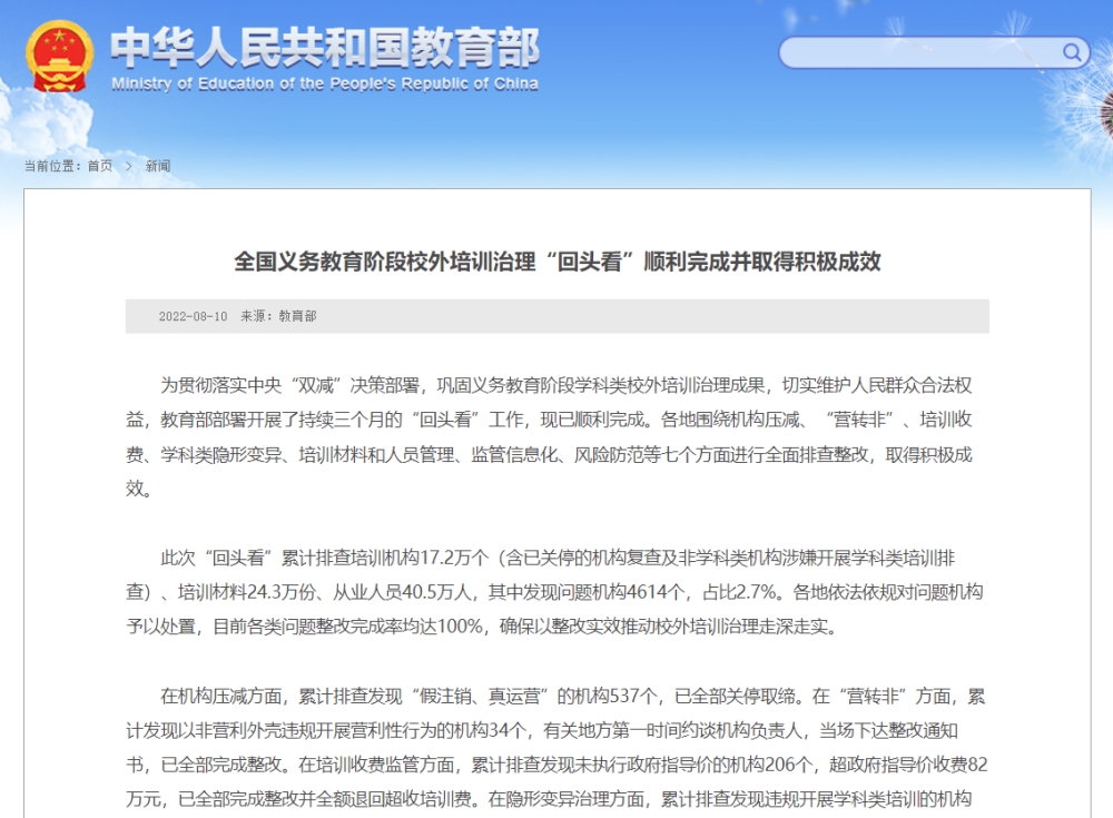 为贯彻落实中央“双减”决策部署,巩固义务教育阶段学科类校外培训治理成果,切实维护人民群众合法权益,教育部部署开展了持续三个月的“回头看”工作,现已顺利完成。各地围绕机构压减、“营转非”、培训收费、学科类隐形变异、培训材料和人员管理、监管信息化、风险防范等七个方面进行全面排查整改,取得积极成效。