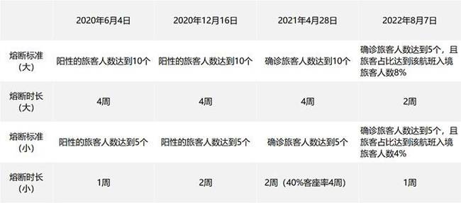2022年8月7日民航局再次调整国际航班熔断措施,“对确诊旅客人数达到5例的航空公司单一入境航班,当确诊旅客占比达到该航班入境旅客人数4%时,暂停运行1周;当确诊旅客占比达到该航班入境旅客人数8%时,暂停运行2周。”