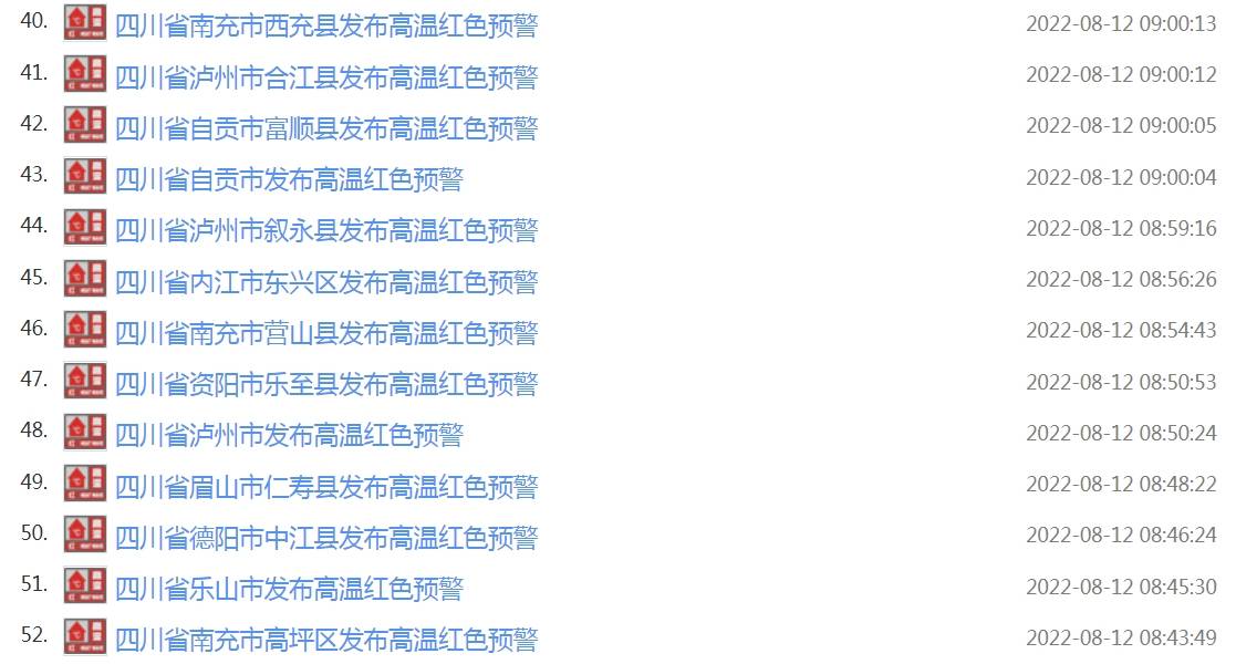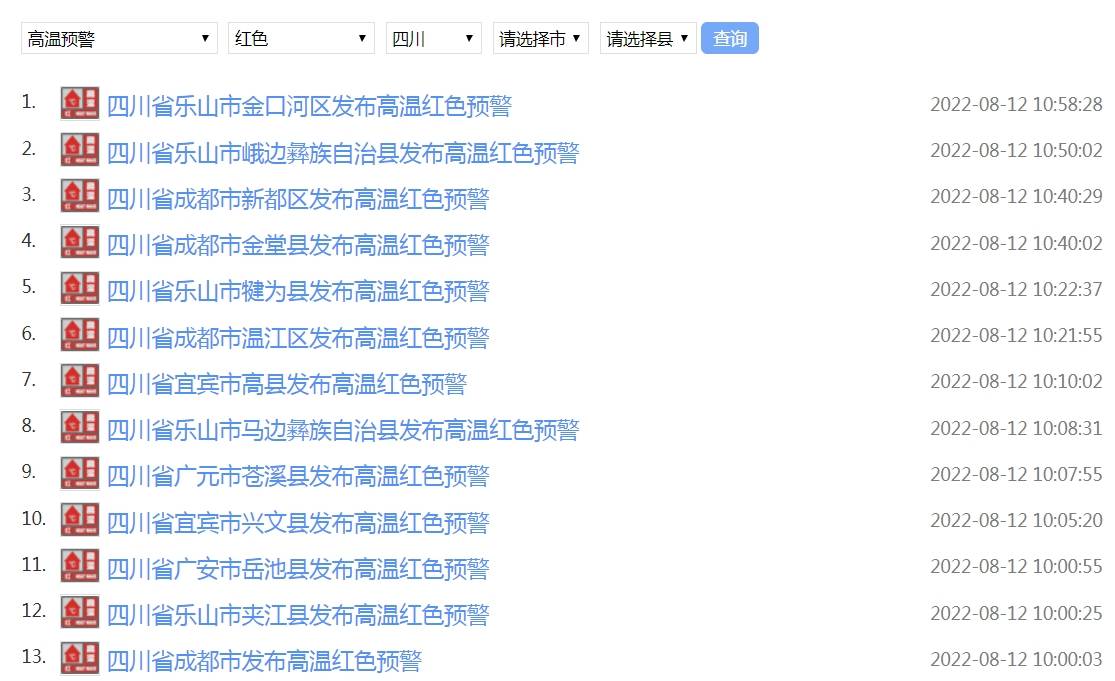 成都市气象台2022年08月12日10时00分对2022年08月11日13时40分发布的高温红色预警信号进行第1次确认: