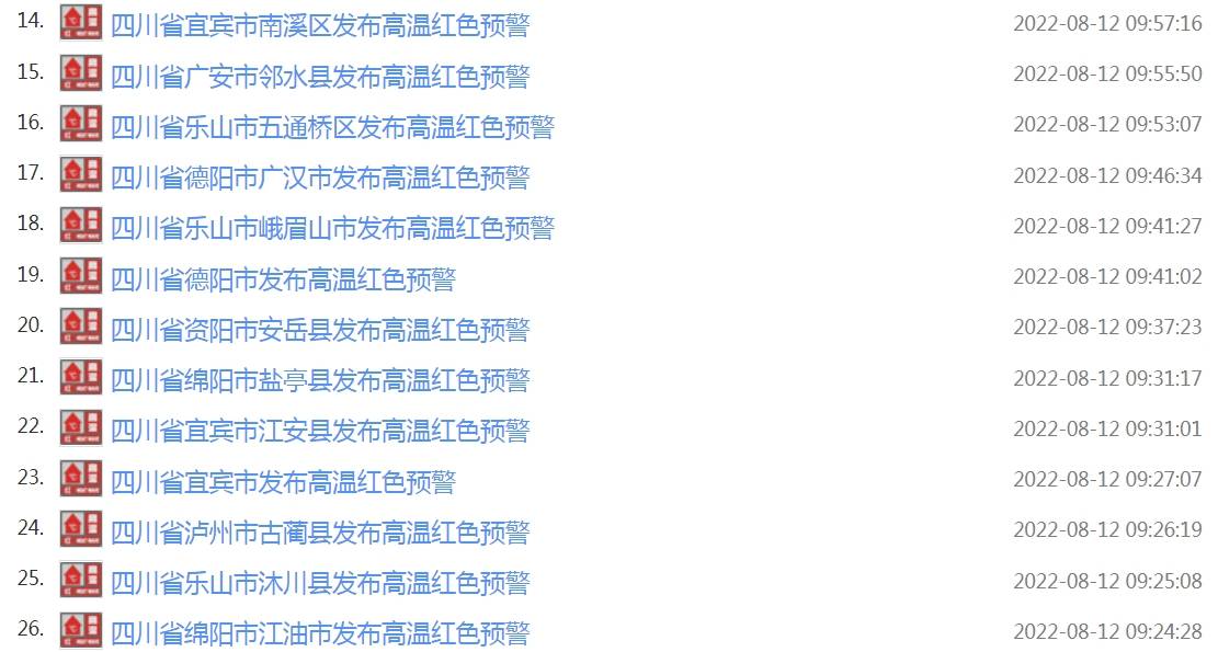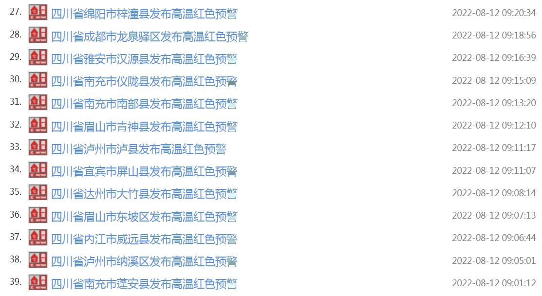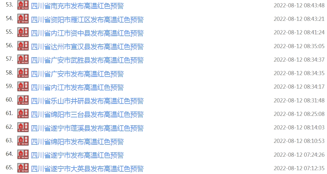 据中国天气网消息,截至12日上午11时,四川各地共发布65个高温红色预警信号。其中,发布高温红色预警信号的市级气象台共有11个,分别是遂宁、绵阳、内江、广安、南充、乐山、泸州、自贡、宜宾、德阳、成都。