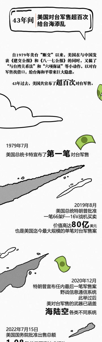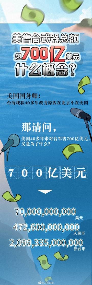 【一组图看懂!#美700亿售台武器啥概念#】美国国务卿近日称,台海现状40多年改变原因在北京,不在美国。然而,#美国43年对台军售超百次#,到底是谁在改变现状?一组图,用数据证明,美国43年700亿美元对台军售,如何坑台湾百姓、给台海添乱↓↓↓
