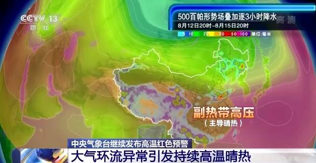 中央气象台首席预报员 陈涛:高温天气比较强的主要原因,还跟大气环流比较异常的变化有关系。从目前的实况来讲,现在西太平洋副热带高压稳定的控制咱们国家从四川盆地到长江中下游这带地区,在副高控制之下,大气是以下沉气流为主,整体上以晴热天气为主,日照辐射也比较强烈,天空少云。这样的话,近地面的加热比较明显,容易造成比较大范围的高温天气。