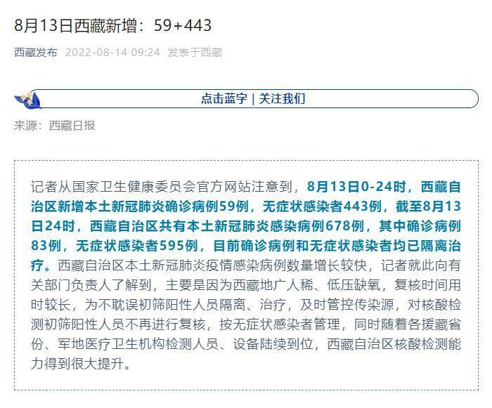 记者从国家卫生健康委员会官方网站注意到,8月13日0-24时,西藏自治区新增本土新冠肺炎确诊病例59例,无症状感染者443例,截至8月13日24时,西藏自治区共有本土新冠肺炎感染病例678例,其中确诊病例83例,无症状感染者595例,目前确诊病例和无症状感染者均已隔离治疗。西藏自治区本土新冠肺炎疫情感染病例数量增长较快,记者就此向有关部门负责人了解到,主要是因为西藏地广人稀、低压缺氧,复核时间用时较长,为不耽误初筛阳性人员隔离、治疗,及时管控传染源,对核酸检测初筛阳性人员不再进行复核,按无症状感染者管理,同时随着各援藏省份、军地医疗卫生机构检测人员、设备陆续到位,西藏自治区核酸检测能力得到很大提升。