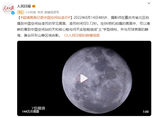 【超清画面记录中国空间站凌月】2022年8月14日4时许,摄影师在重庆市渝北区拍摄到中国空间站凌月的罕见画面,凌月时间仅0.72秒。在8K相机拍摄的画面中,可以清晰的看到中国空间站的天和核心舱与问天实验舱组成“土”字型结构,并与月球表面的静海、第谷环形山等区域合影。