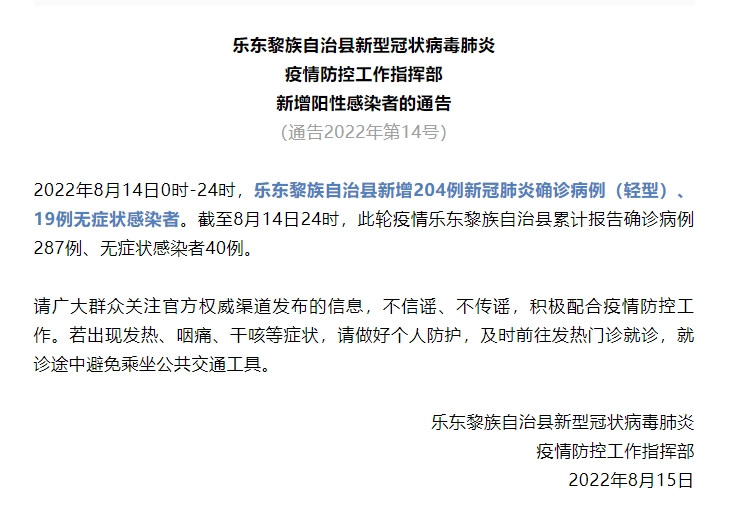 2022年8月14日0—24时,海南乐东黎族自治县新增204例新冠肺炎确诊病例(轻型)、19例无症状感染者。截至8月14日24时,此轮疫情乐东黎族自治县累计报告确诊病例287例、无症状感染者40例。