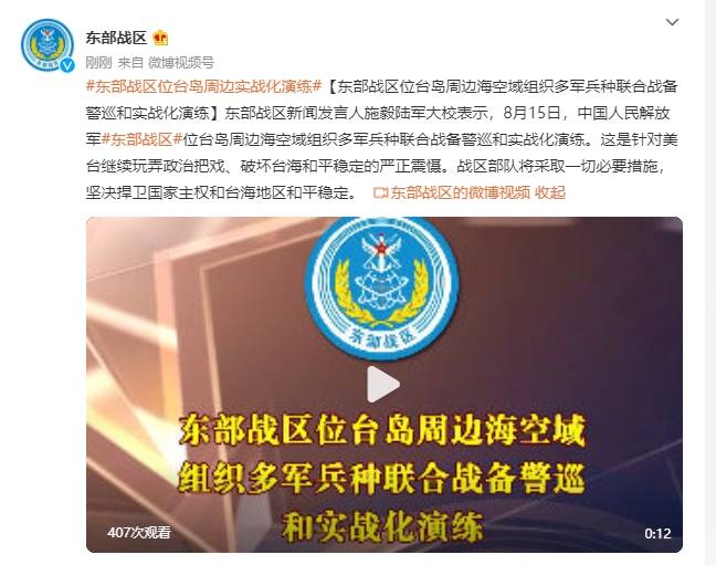 据@东部战区微博消息,东部战区新闻发言人施毅陆军大校表示,8月15日,中国人民解放军东部战区位台岛周边海空域组织多军兵种联合战备警巡和实战化演练。这是针对美台继续玩弄政治把戏、破坏台海和平稳定的严正震慑。战区部队将采取一切必要措施,坚决捍卫国家主权和台海地区和平稳定。