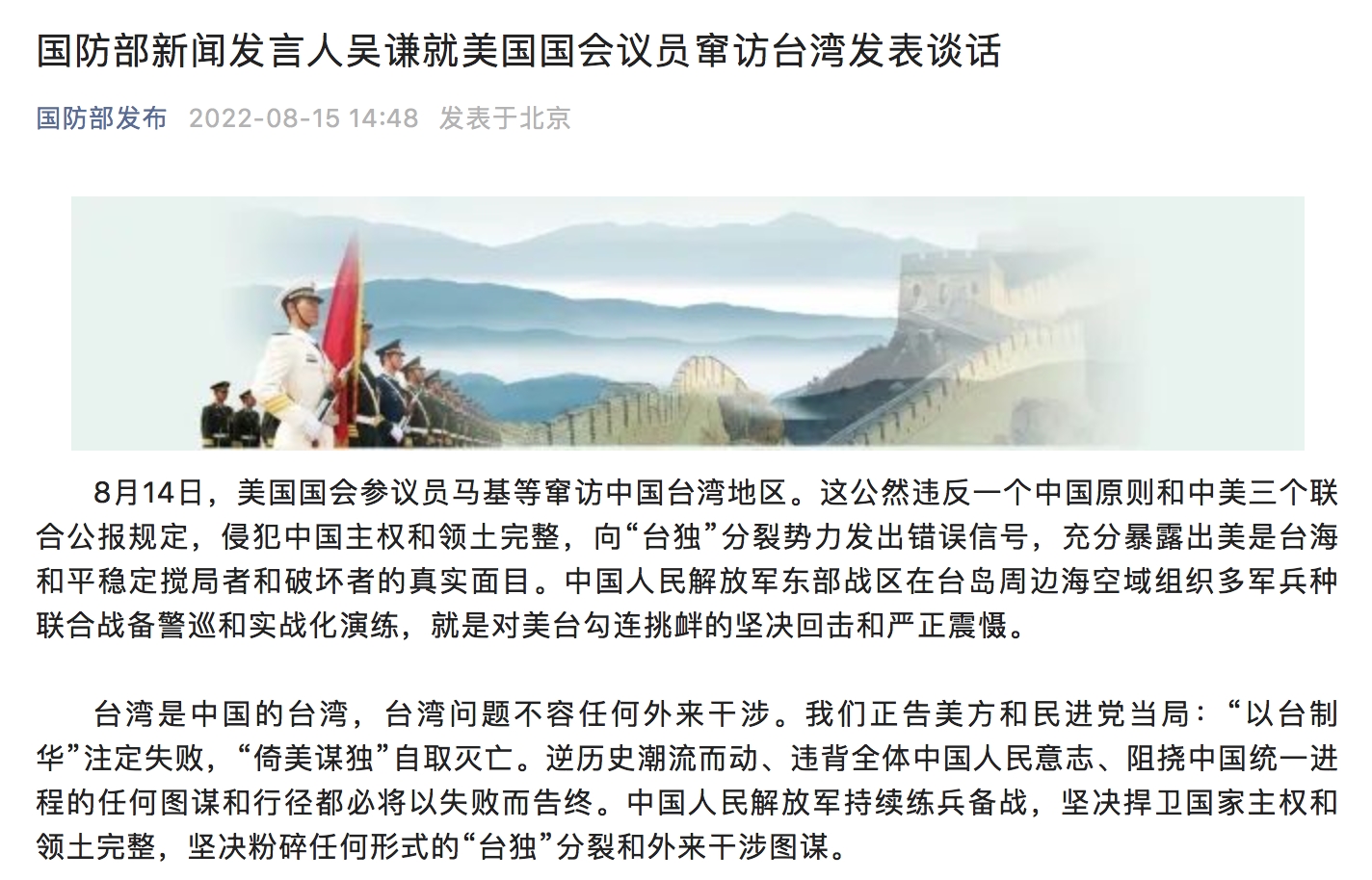 8月14日,美国国会参议员马基等窜访中国台湾地区。这公然违反一个中国原则和中美三个联合公报规定,侵犯中国主权和领土完整,向“台独”分裂势力发出错误信号,充分暴露出美是台海和平稳定搅局者和破坏者的真实面目。中国人民解放军东部战区在台岛周边海空域组织多军兵种联合战备警巡和实战化演练,就是对美台勾连挑衅的坚决回击和严正震慑。
