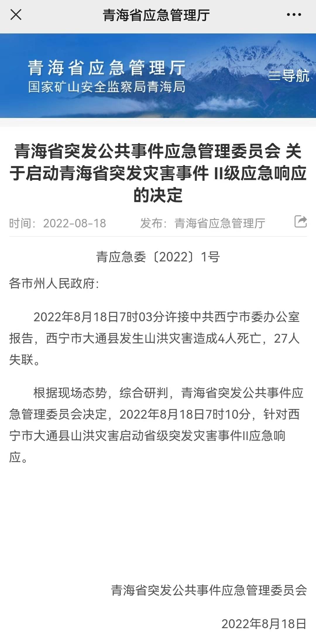 2022年8月18日7时03分许接中共西宁市委办公室报告,西宁市大通县发生山洪灾害造成4人死亡,27人失联。