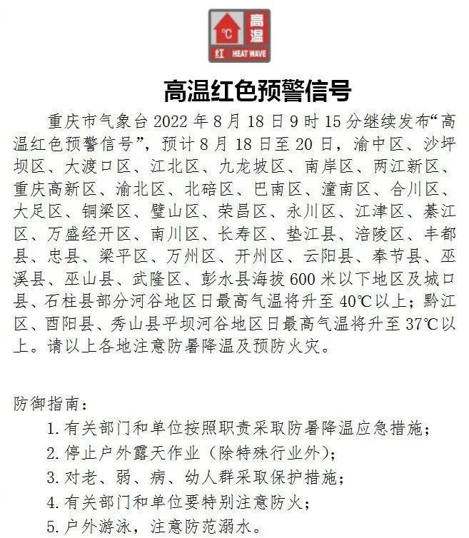 预计8月18日至20日,渝中区、沙坪坝区、大渡口区、江北区、九龙坡区、南岸区、两江新区、重庆高新区、渝北区、北碚区、巴南区、潼南区、合川区、大足区、铜梁区、璧山区、荣昌区、永川区、江津区、綦江区、万盛经开区、南川区、长寿区、垫江县、涪陵区、丰都县、忠县、梁平区、万州区、开州区、云阳县、奉节县、巫溪县、巫山县、武隆区、彭水县海拔600米以下地区及城口县、石柱县部分河谷地区日最高气温将升至40℃以上;黔江区、酉阳县、秀山县平坝河谷地区日最高气温将升至37℃以上。请以上各地注意防暑降温及预防火灾。