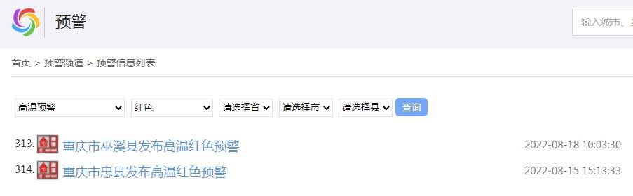 全国有314个高温红色预警正在生效中