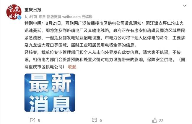 据重庆日报消息,国网重庆市区供电公司发布特别申明:8月21日,互联网广泛传播接市区供电公司紧急通知:因江津支坪仁坨山火迅速蔓延,即将危及到珞璜电厂及其输电线路,政府正在有序安排珞璜及周边区域居民紧急疏散,一但危及到发电站及配电设施,市电力公司将下达大区停电的命令,主要涉及九龙坡大渡口等区域,届时工业和居民用电将全停的信息。