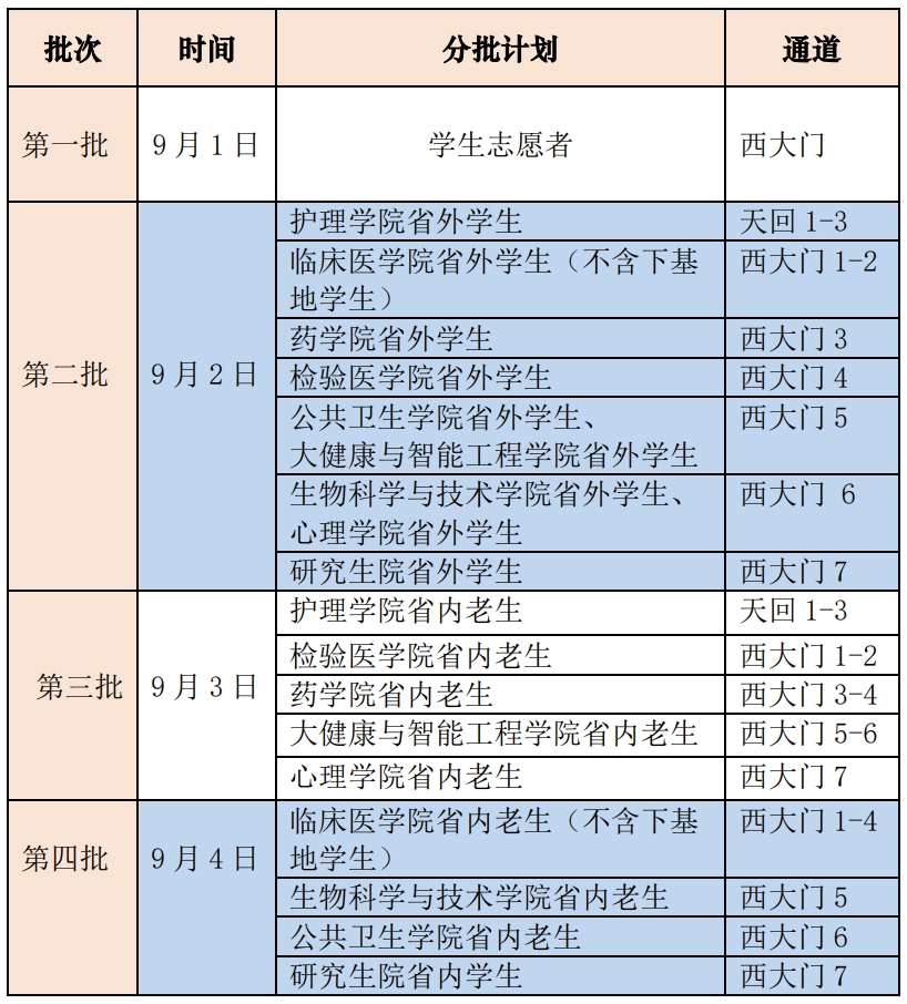 一、本科生、研究生(含研究生新生)报到时间推迟到9月1—2日(不再分批)。