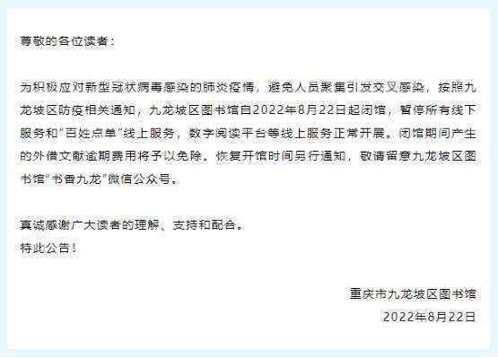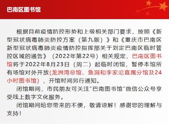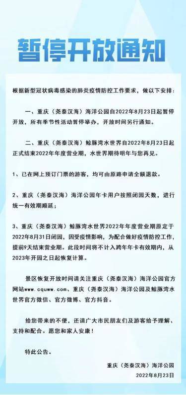 根据当前疫情防控需要,按照《新型冠状病毒肺炎防控方案(第九版)》相关规定,经专家研判,并经两江新区疫情防控指挥部决定,自2022年8月22日16:10起,对重庆欢乐谷主题公园(含玛雅海滩水公园)实施临时管控。