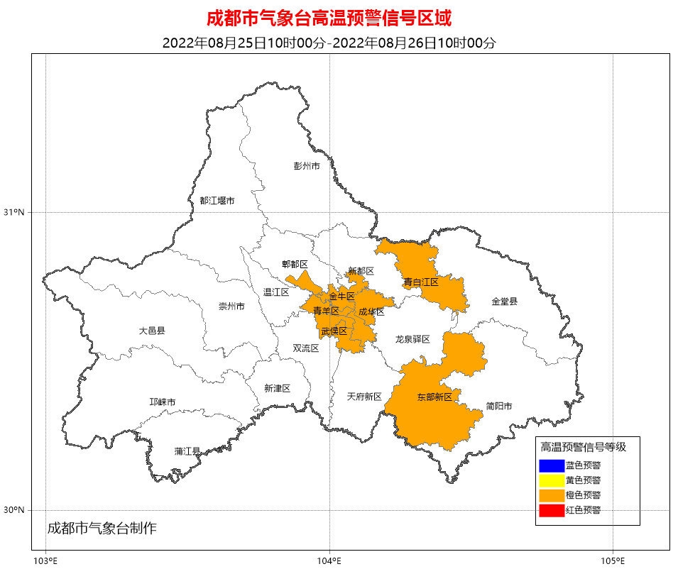 成都市气象台2022年08月25日10时00分更新高温红色预警信号为高温橙色预警信号:预计成都市东部新区、锦江区、青羊区、武侯区、成华区、金牛区、高新南区、高新西区和青白江区的全部镇(街道)未来24小时内最高气温将升至35℃以上。请注意防暑降温。