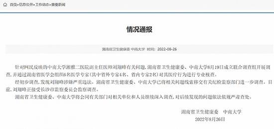 湖南卫健委网站8月26日消息,湖南省卫生健康委、中南大学通报,针对网民反映的中南大学湘雅二医院副主任医师刘翔峰有关问题,湖南省卫生健康委、中南大学8月19日成立联合调查组开展调查,并通过湖南省医学会组织6名医学专家(其中省外专家4名、省内专家2名)对其医疗行为进行专业核查。