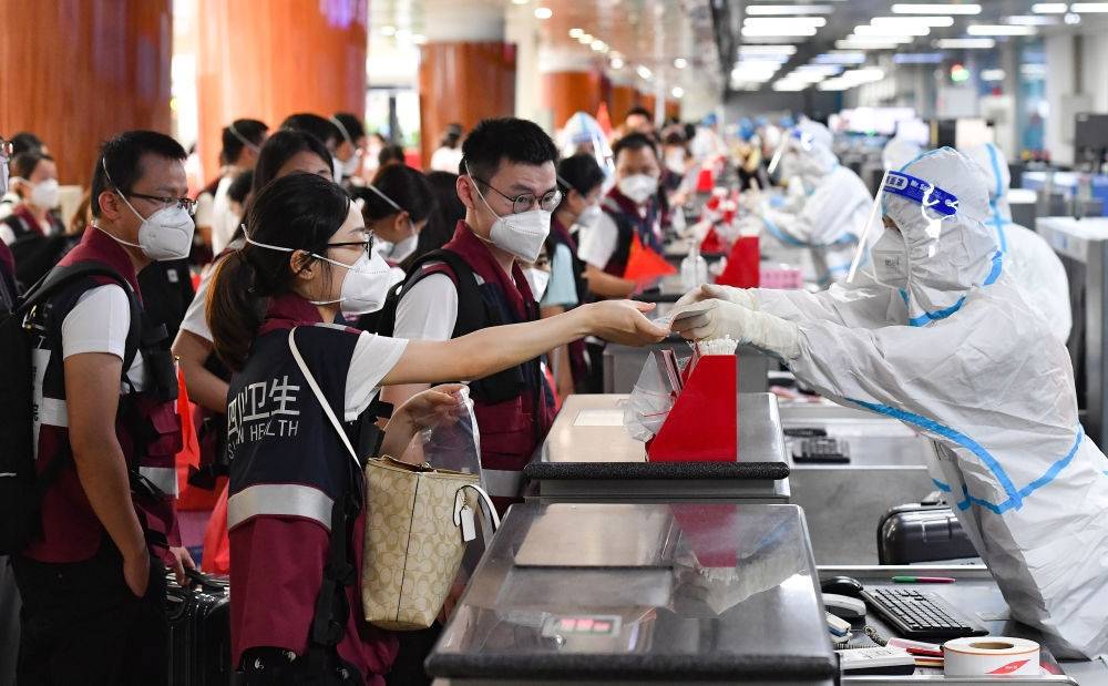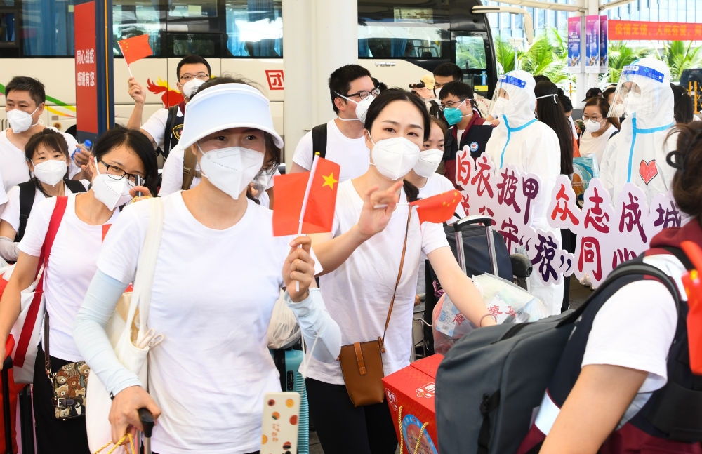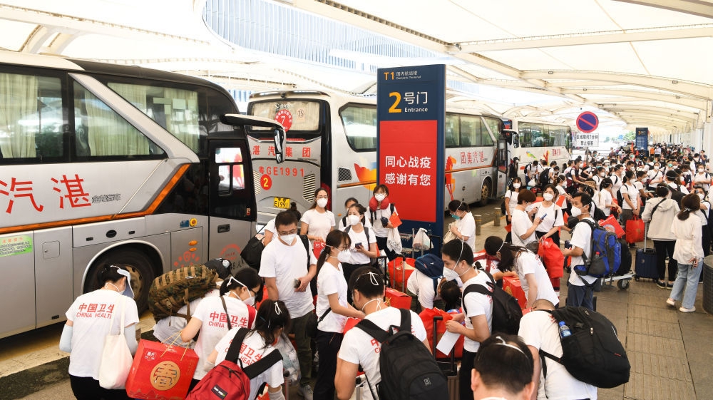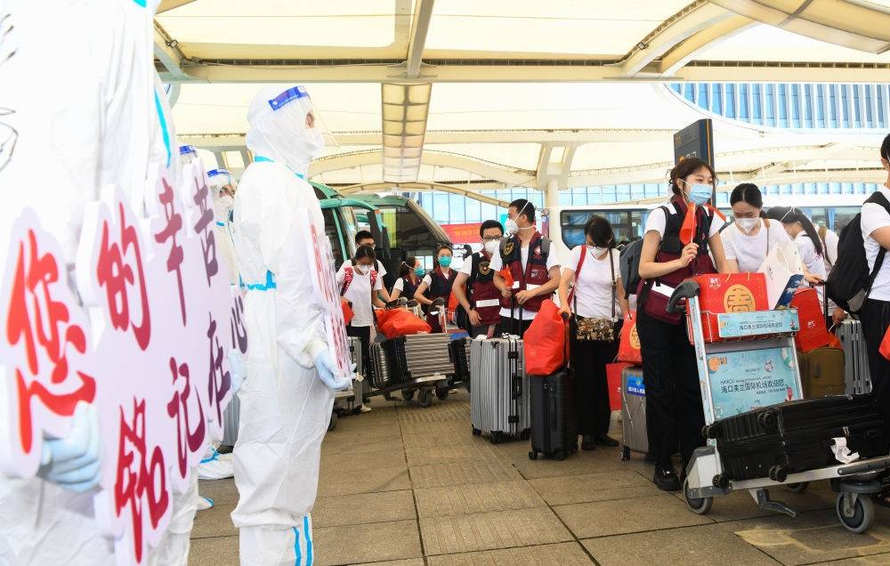 8月27日,四川省支援海南省儋州市的首批400余名医疗队队员从海口美兰机场登机返程。新华社记者 杨冠宇 摄影报道