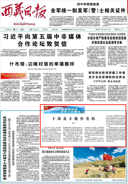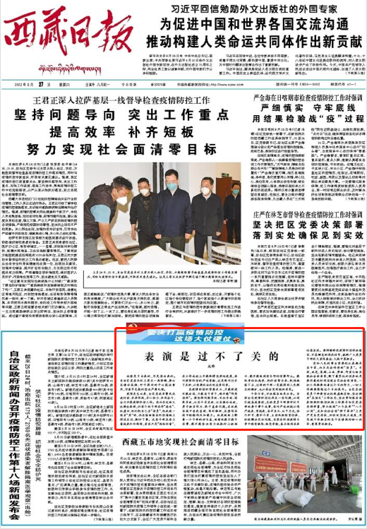 值得注意的是,8月25日-27日,西藏日报连续三天在头版发表重磅评论文章,对疫情防控中暴露出的形式主义、官僚主义现象予以揭批。