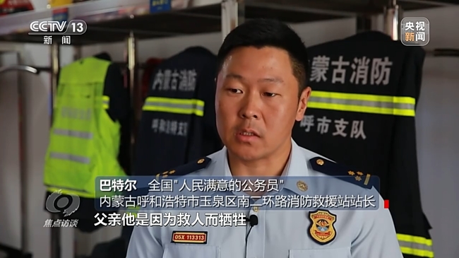 全国“人民满意的公务员” 内蒙古呼和浩特市玉泉区南二环路消防救援站站长 巴特尔:奶奶和母亲从小教育我,长大以后要做一个为人民服务的人。父亲他是因为救人而牺牲,在我的心中,父亲永远是高大的,我也想尝试一下父亲的职业,沿着父亲的路继续走下去。