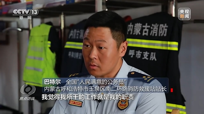 全国“人民满意的公务员” 内蒙古呼和浩特市玉泉区南二环路消防救援站站长 巴特尔:救人民于水火、助人民于危难,我觉得我所干的工作就是我的职责,就是我应该干的,这是本职工作。如果我被称为英雄的话,我们所有消防救援队伍的人员都是英雄。因为每一个人都是出生入死,每一个人面临灾害现场、火灾现场都会义无反顾。