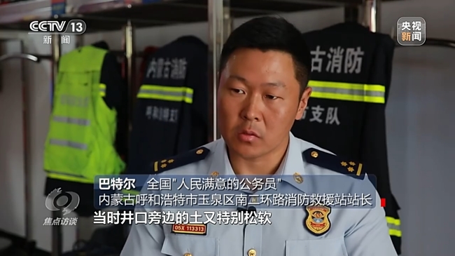 全国“人民满意的公务员” 内蒙古呼和浩特市玉泉区南二环路消防救援站站长 巴特尔:(枯井)最少有8米(深),里面特别黑,什么都看不到,当时井口旁边的土又特别松软。在下井之前,好多人都说,“队长你别下去,我们下去吧。”因为他们知道我父亲就是井下救援牺牲的,我说没事,我学过。
