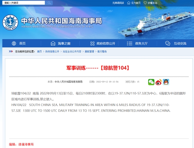 总台记者从海南海事局获悉,清澜海事局发布琼航警104/22,南海 2022年09月13日至15日,每日21时至23时,在以19-37.12N/110-57.32E为中心,6海里为半径的圆形区域内进行军事训练,禁止驶入。