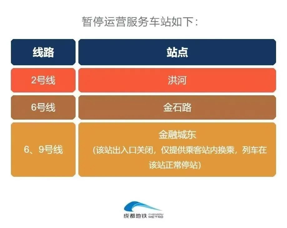 因疫情防控需要,地铁2号线洪河站、6号线金石站、6/9号线金融城东站仍处于暂停运营服务状态,恢复时间待另行通知。(金融城东站出入口关闭,仅提供乘客站内换乘,列车在该站正常停站。)