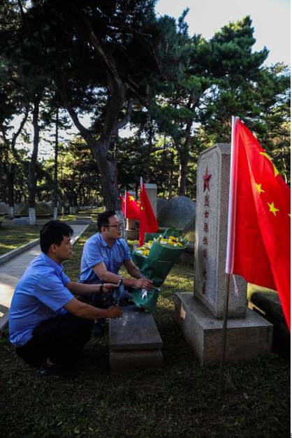 9月13日,航空工业沈飞公司的青年技术工人方文墨和同事们前往烈士陵园祭扫,他们把孙生禄烈士的墓碑擦拭干净,又把一架沈飞生产的先进隐身战机“鹘鹰”的模型放在了墓前。