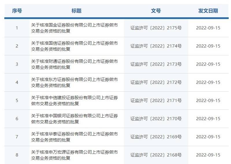 据证监会网站9月16日消息,证监会批复首批8家券商的科创板做市商资格,分别是:申万宏源、华泰证券、银河证券、中信建投、东方证券、财通证券、国信证券、国金证券。