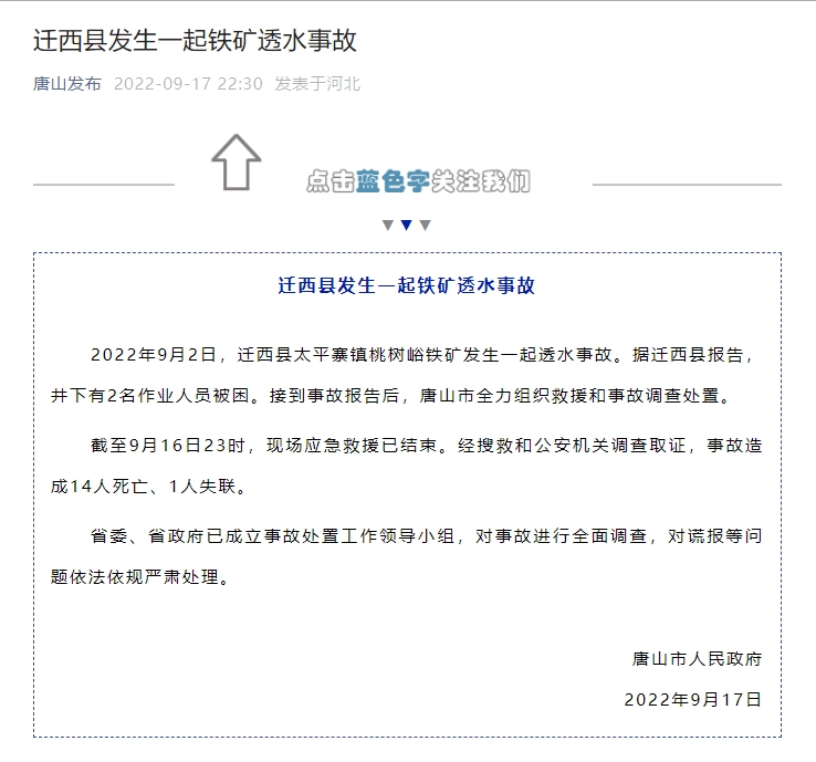 2022年9月2日,迁西县太平寨镇桃树峪铁矿发生一起透水事故。据迁西县报告,井下有2名作业人员被困。接到事故报告后,唐山市全力组织救援和事故调查处置。