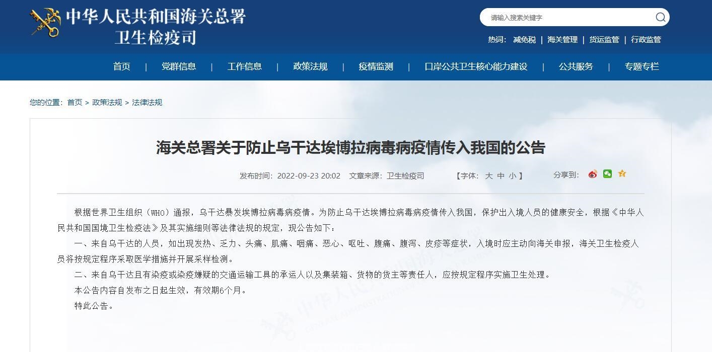 根据世界卫生组织(WHO)通报,乌干达暴发埃博拉病毒病疫情。为防止乌干达埃博拉病毒病疫情传入我国,保护出入境人员的健康安全,根据《中华人民共和国国境卫生检疫法》及其实施细则等法律法规的规定,现公告如下: