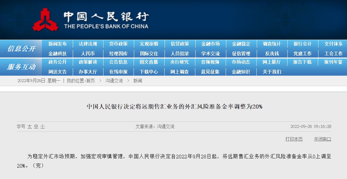 为稳定外汇市场预期,加强宏观审慎管理,中国人民银行决定自2022年9月28日起,将远期售汇业务的外汇风险准备金率从0上调至20%。
