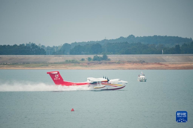 9月27日,“鲲龙”AG600M在水上滑行汲水。新华社记者 伍志尊 摄