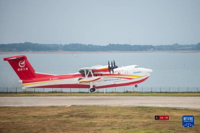9月27日,“鲲龙”AG600M从漳河机场滑行起飞。新华社记者 伍志尊 摄