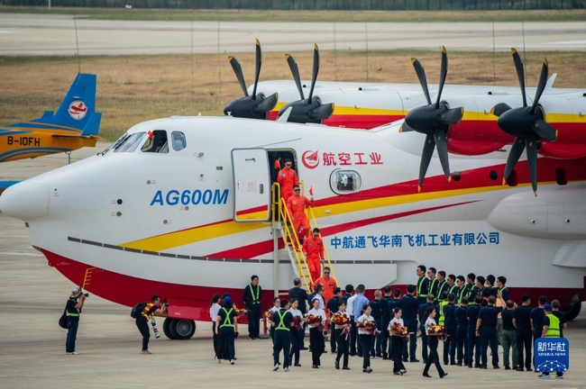 9月27日,“鲲龙”AG600M机组人员在完成试验后走下飞机。新华社记者 伍志尊 摄