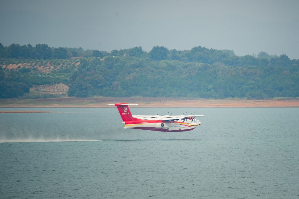 9月27日,“鲲龙”AG600M在水上滑行汲水。新华社记者 伍志尊 摄