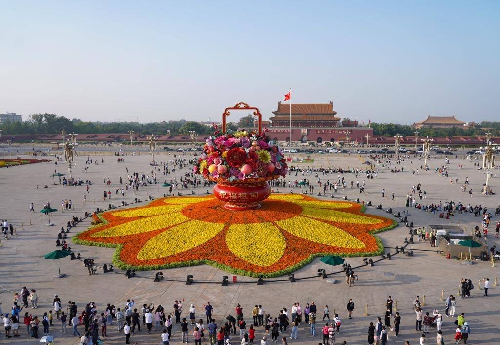 图为天安门广场上的“祝福祖国”巨型花果篮。新华社记者 陈钟昊 摄
